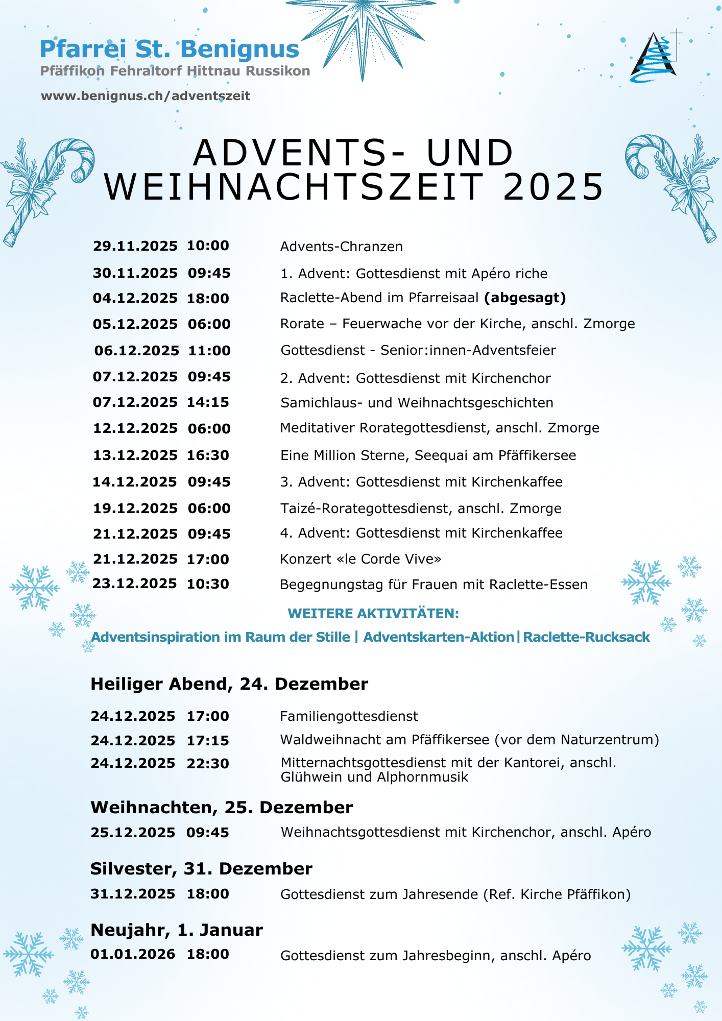 Es gibt für jeden etwas zu erleben, und besonders Familien sind herzlich eingeladen, beim Samichlaus und Weihnachtsgeschichten oder am 24.12.2025, 17 Uhr am Familiengottesdienst «Weihnachten und Koffer» in unserer Kirche dabei zu sein.