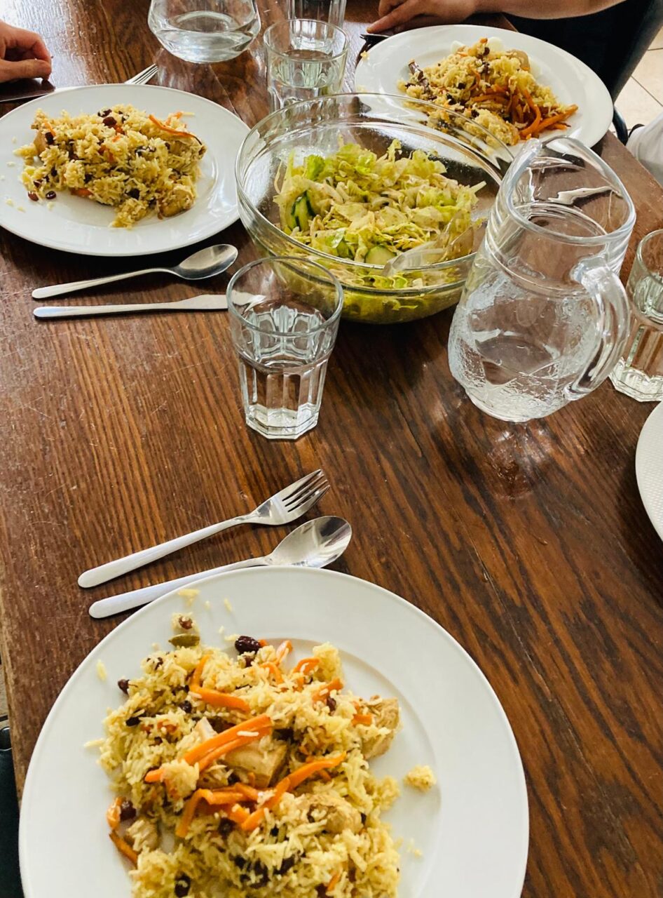 Gemeinsam ein Mittagessen kochen, gemütlich zusammen essen und reden.