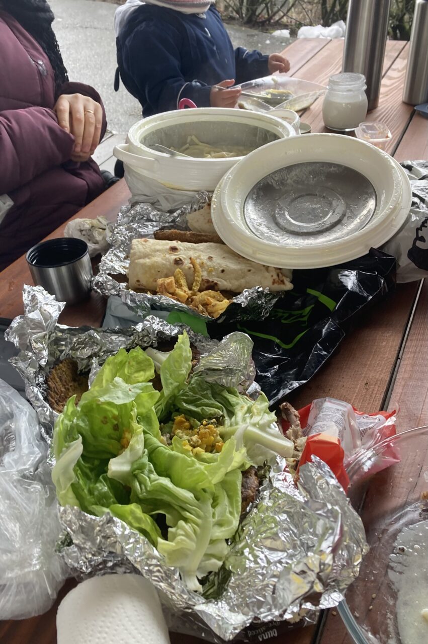 Zum Mittagessen gab es ein buntes, selbst mitgebrachtes Picknick: frittierte Kochbananen, Falafel, grillierte Auberginen, Kartoffeltätschli, warme Suppe und vieles mehr.